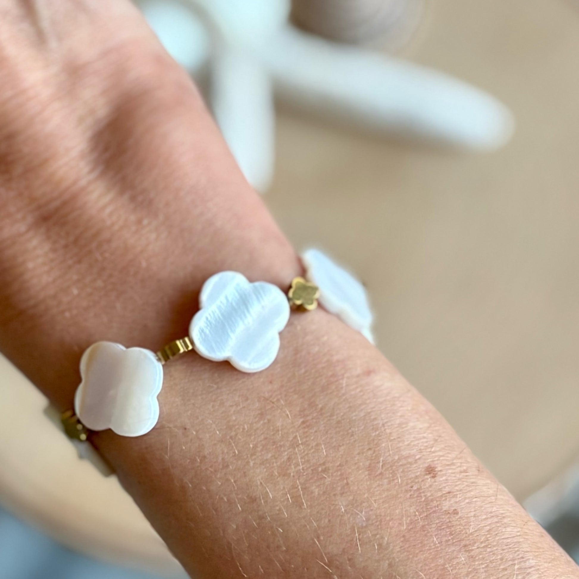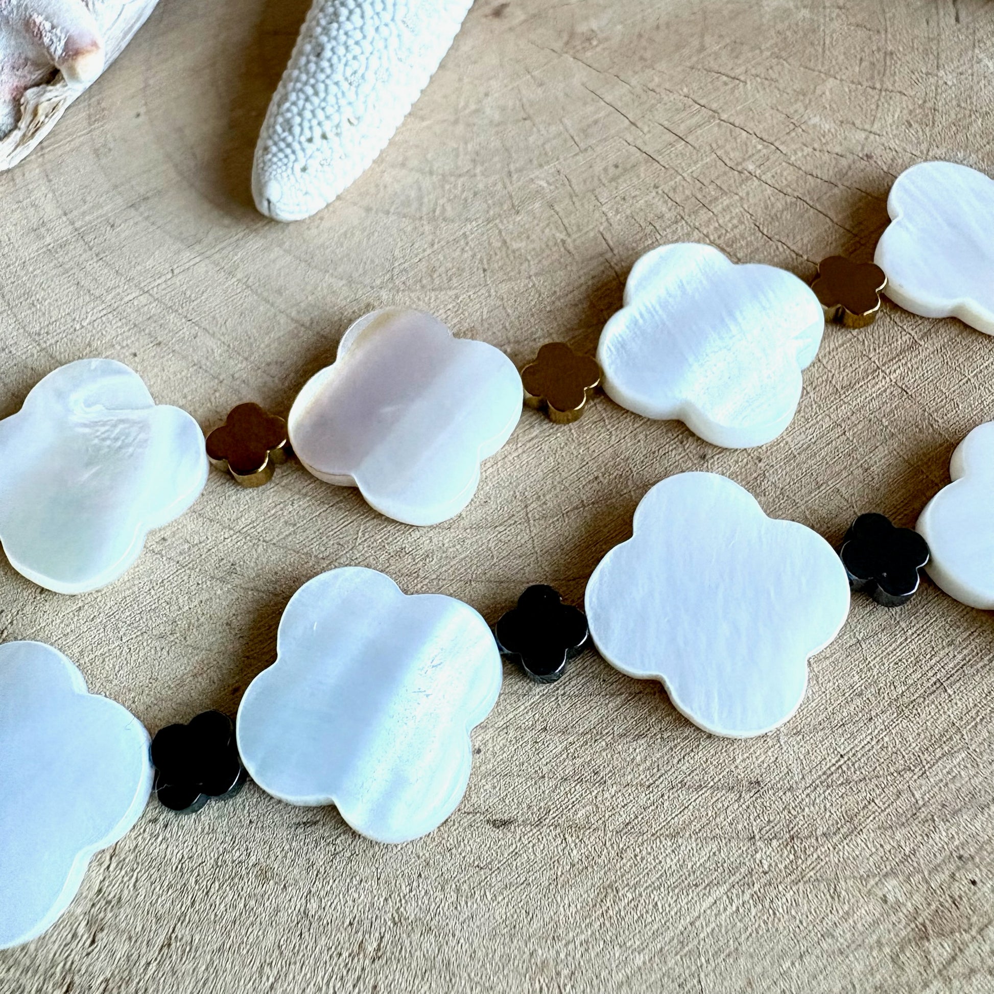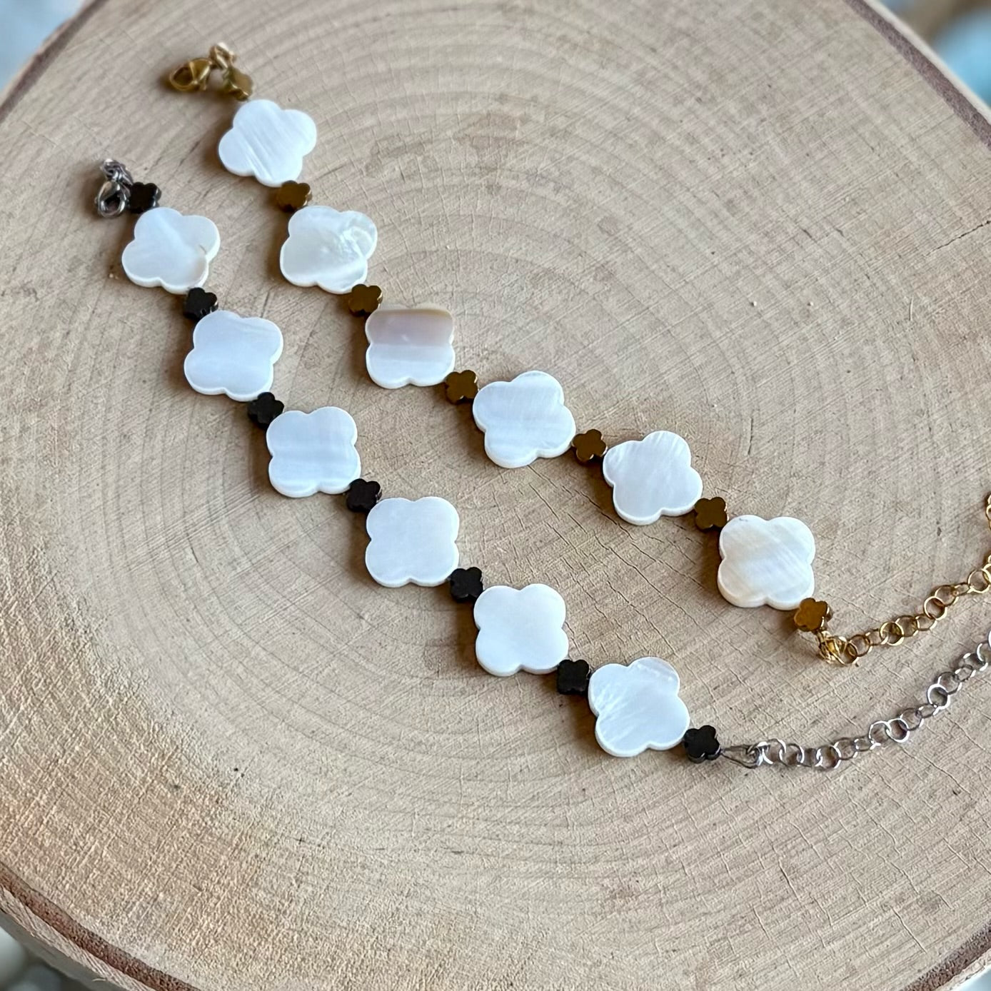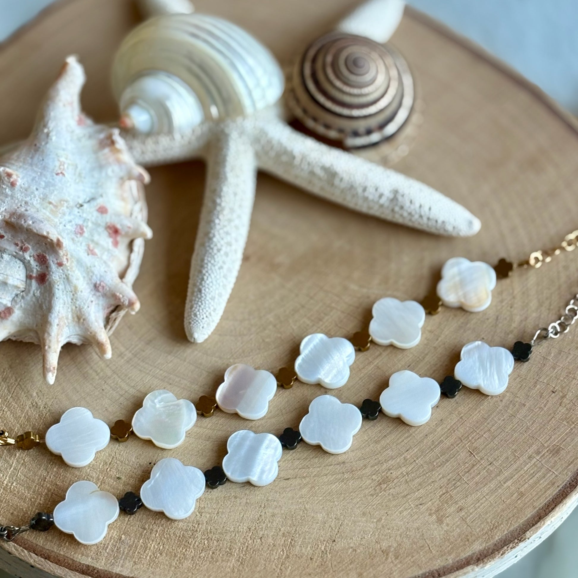 Bracelet très chic fait à la main avec des perles en forme de trèfle en nacre et hématite