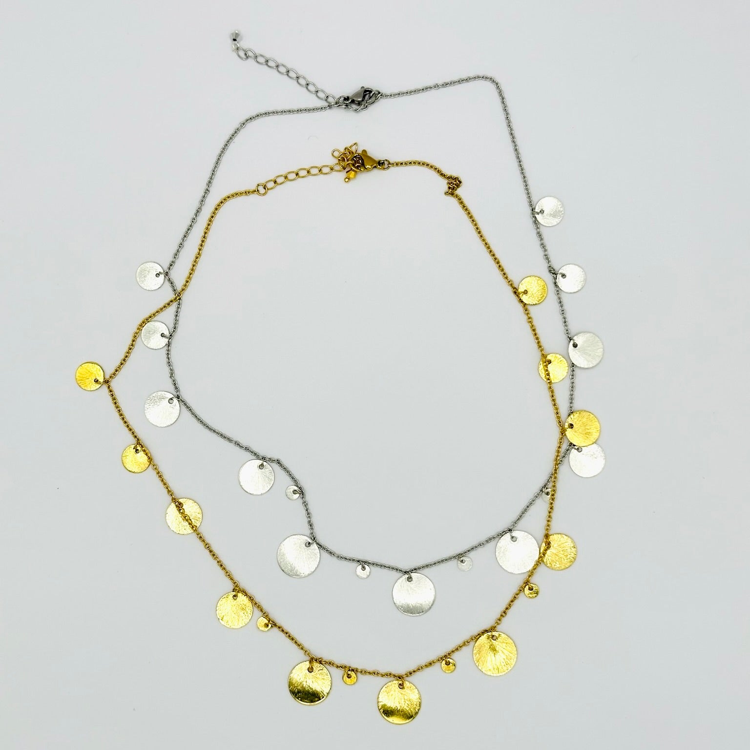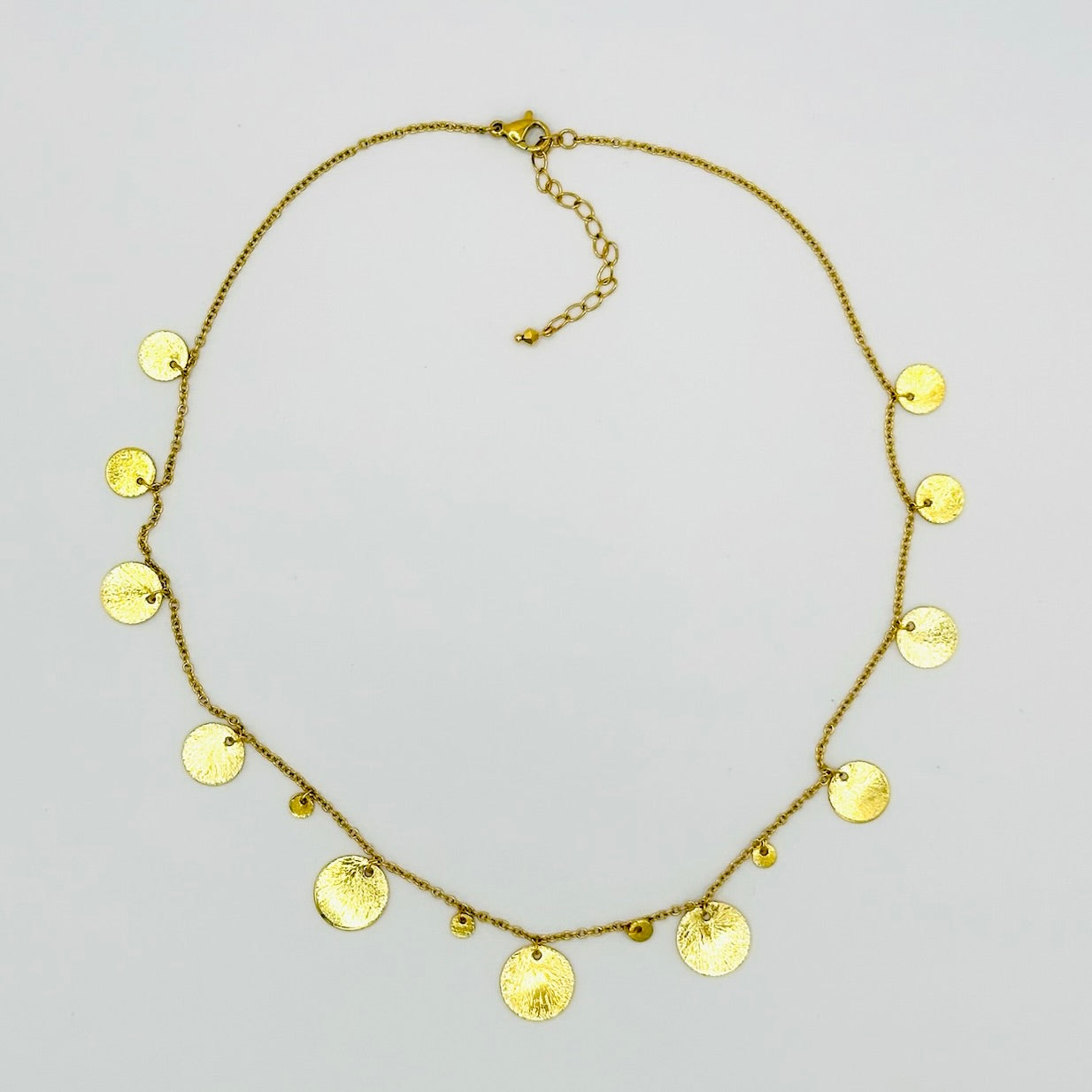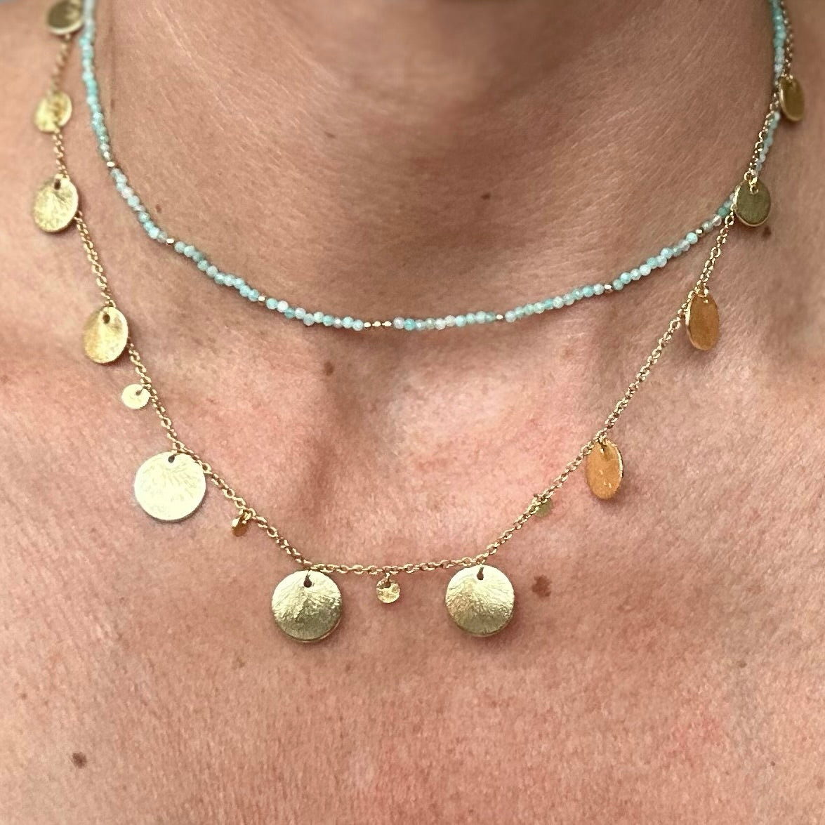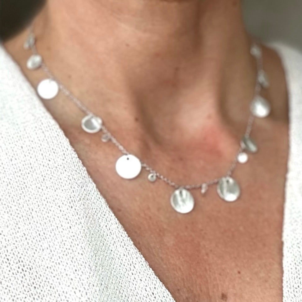 Es ist mit runden Pailletten in verschiedenen Größen verziert, sehr elegant und raffiniert, sowohl einzeln als auch in Kombination mit anderen Halsketten der Marke zu tragen.