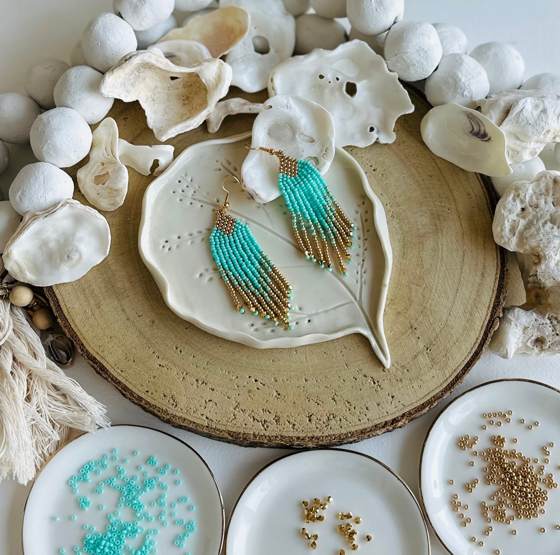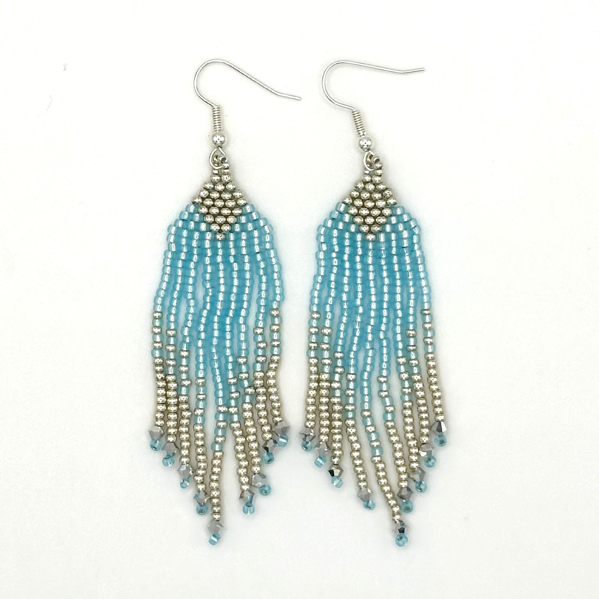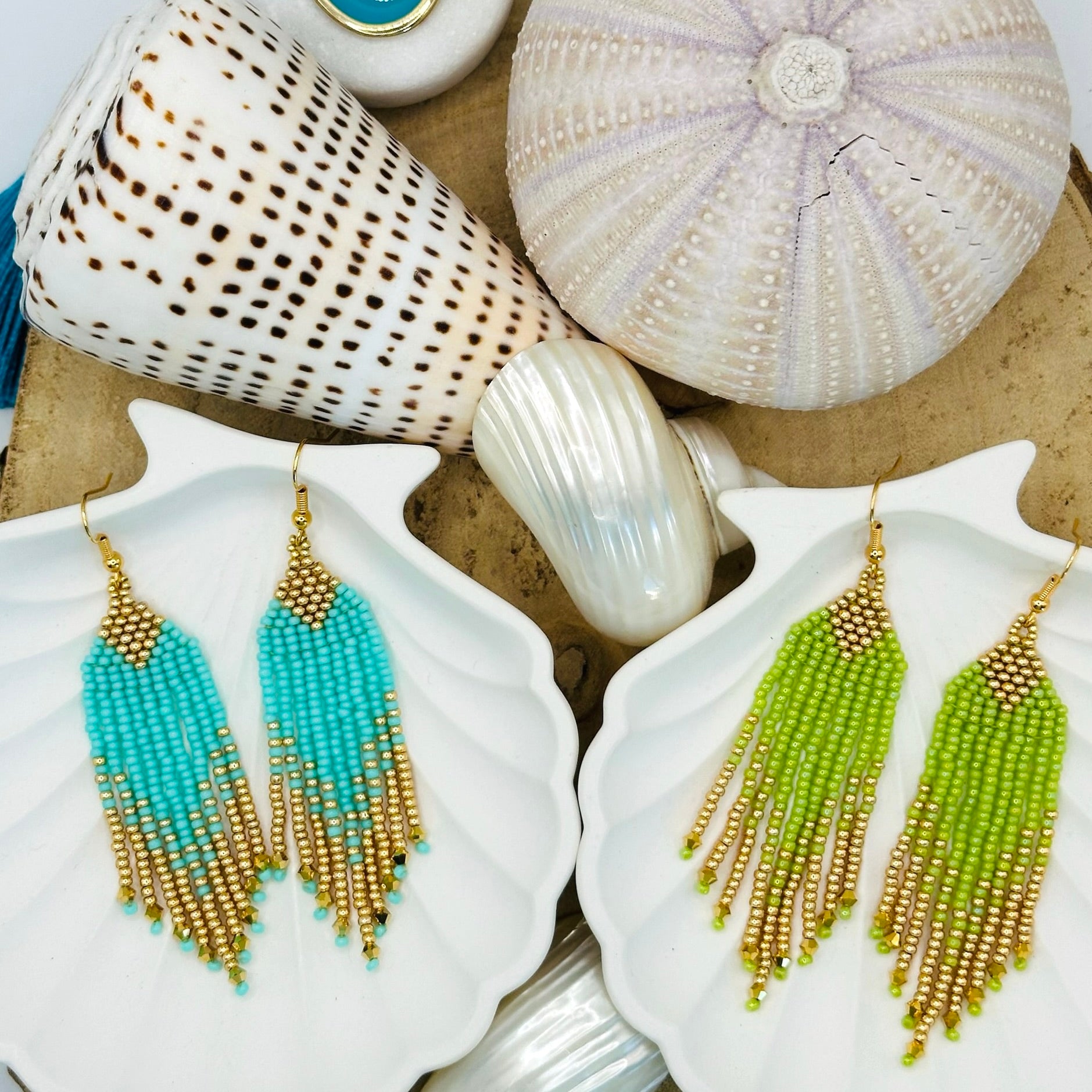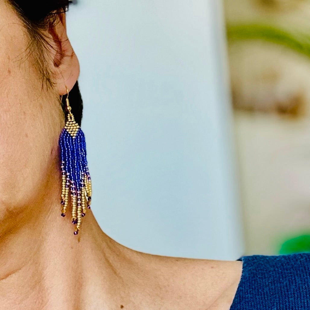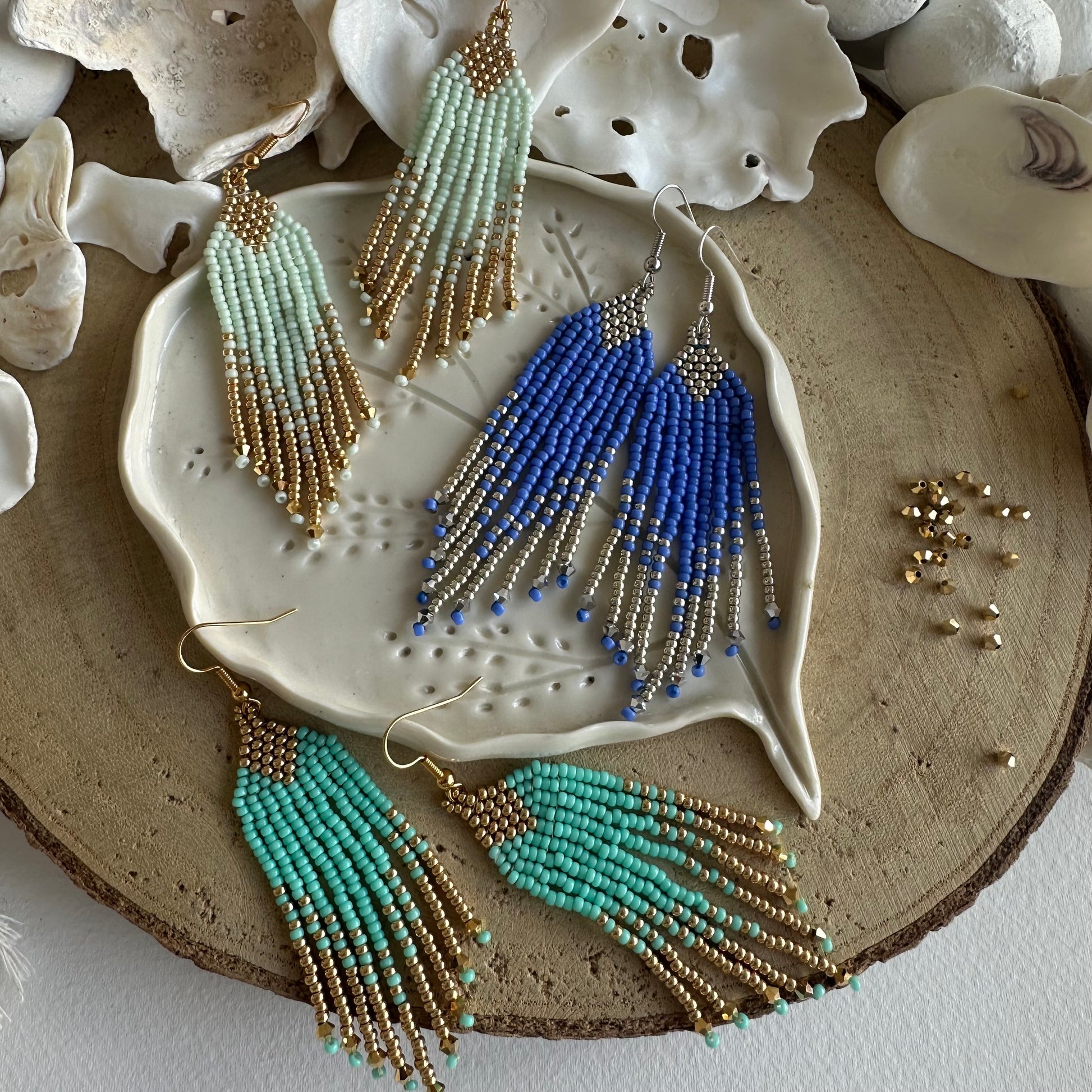 Von Hand gewebte hängende Ohrringe, gefertigt mit einer sehr feinen Nadel, eine Technik, die Präzision und Geduld erfordert. Die gewebten Perlen bestehen aus kleinen Glas-Rocailles und funkelnden Kristall-Bicone-Perlen.