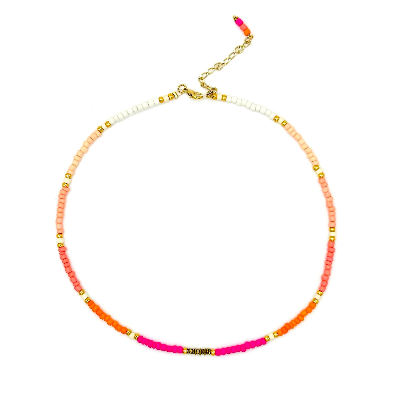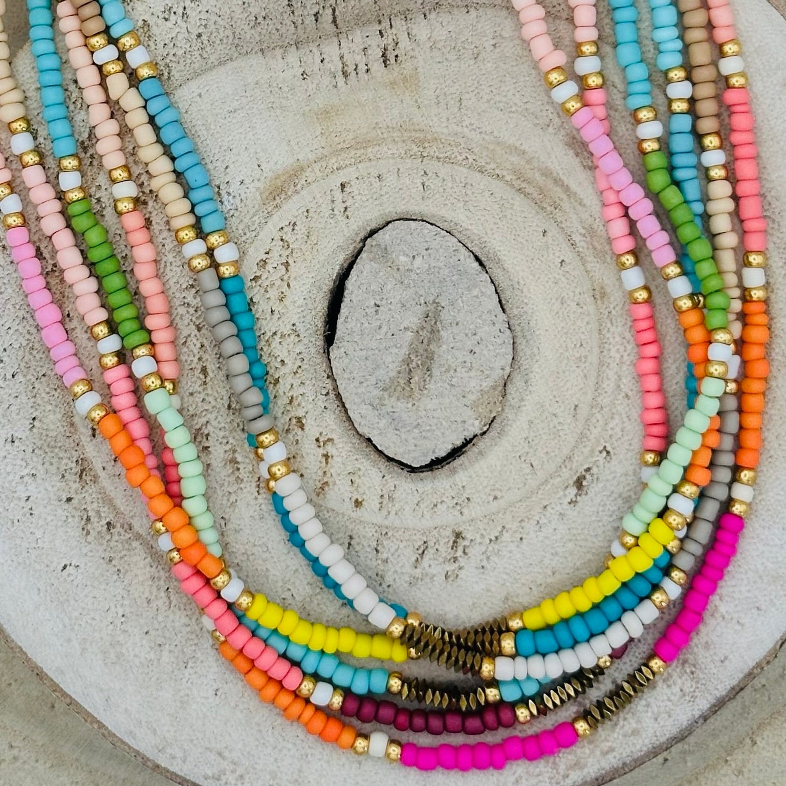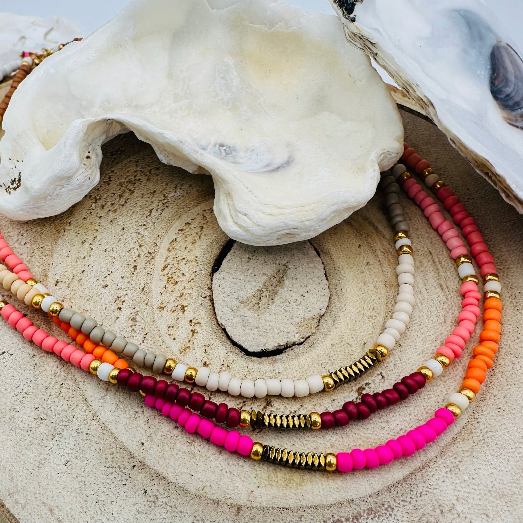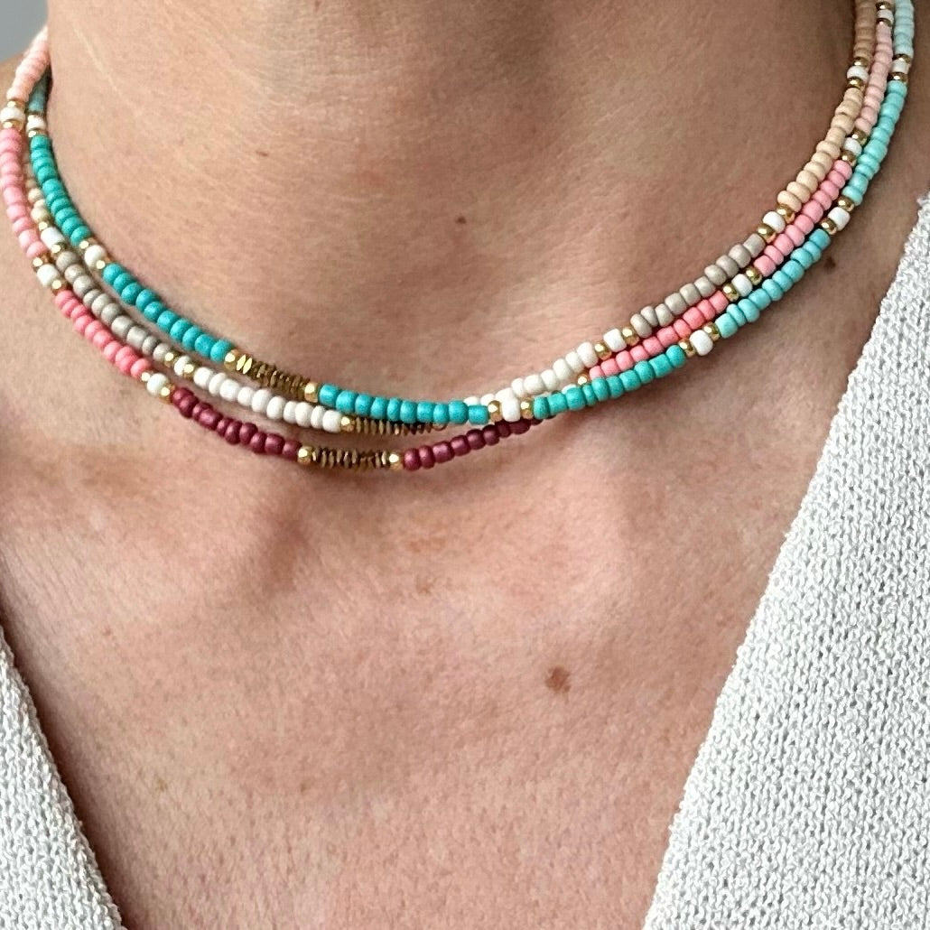 Farbige Halskette mit hübschen matten Rocailles und kleinen gold- oder silberfarbenen Glasperlen. Je nach Modell sind die Farben leuchtend oder pastellfarben, und die harmonische Farbabstimmung ermöglicht vielfältige Kombinationsmöglichkeiten. Diese Halsketten können einzeln oder in Kombination mit dem gleichen oder anderen Modellen der Marke getragen werden.