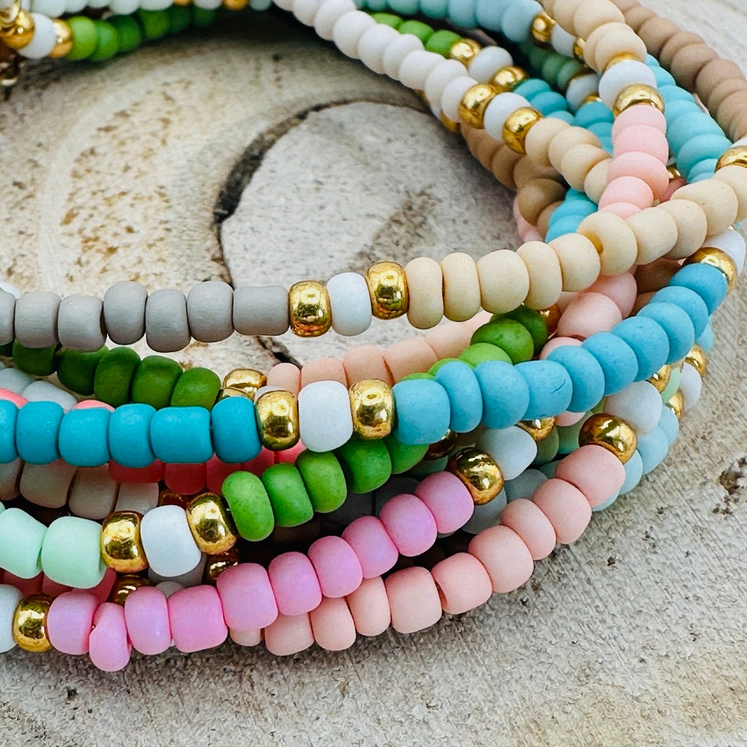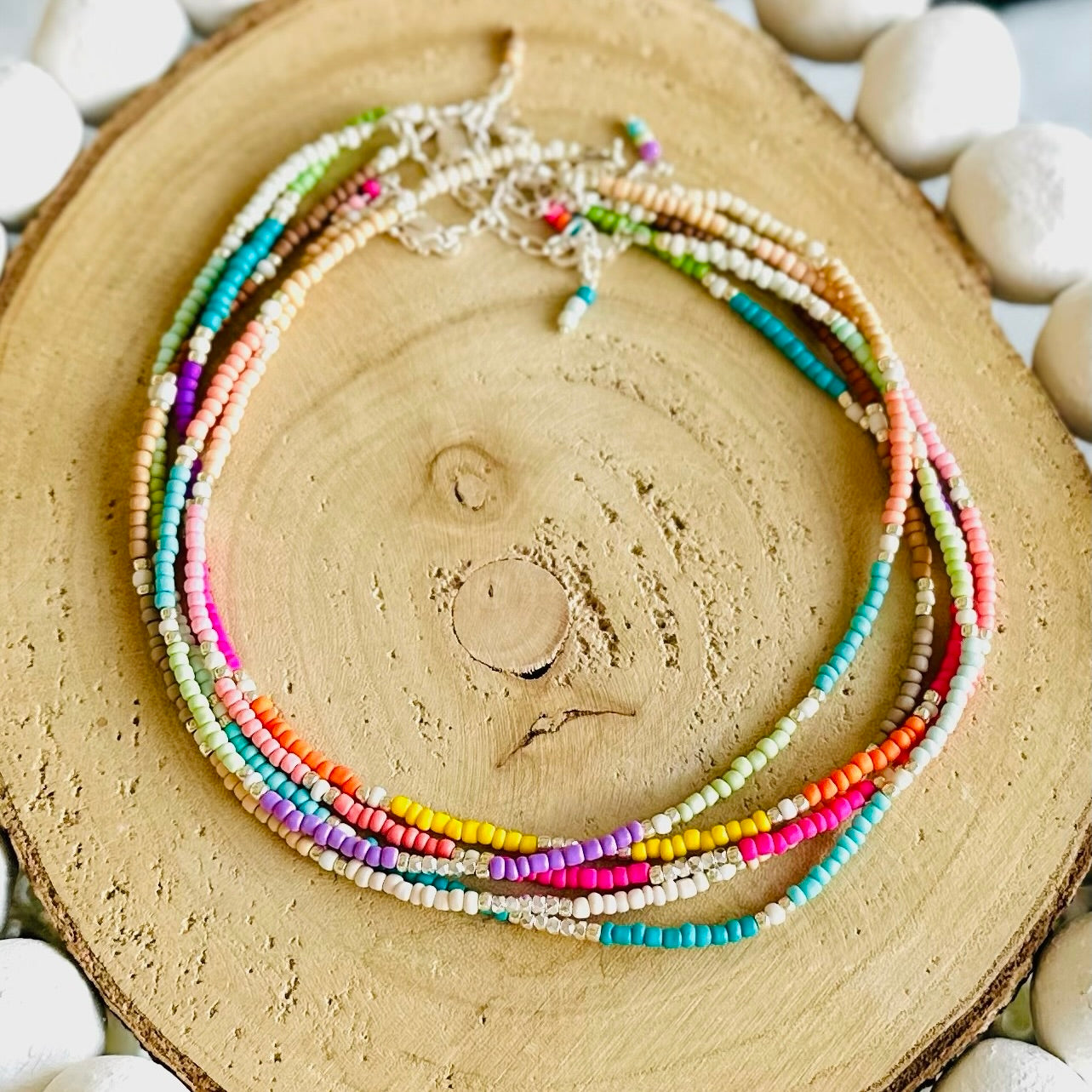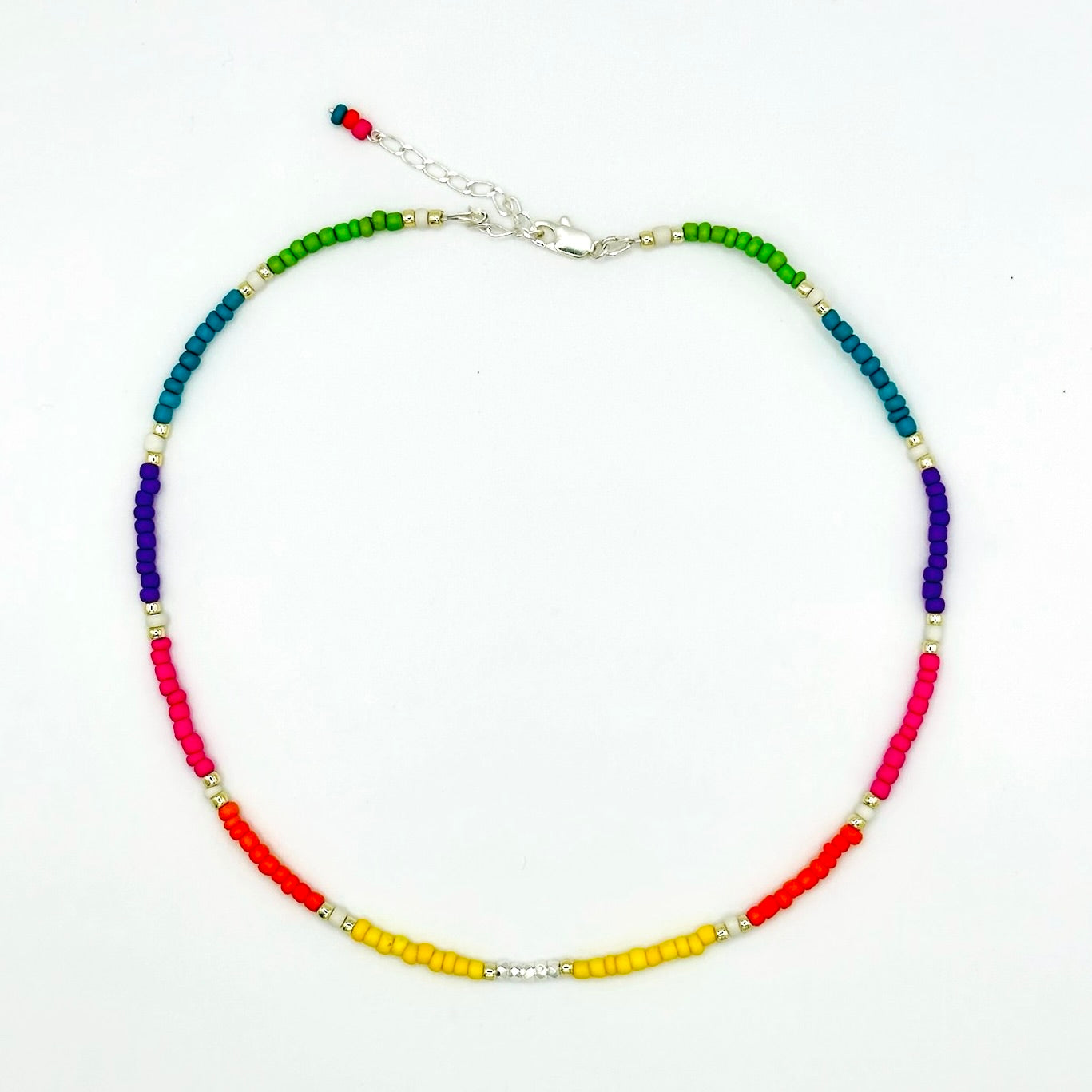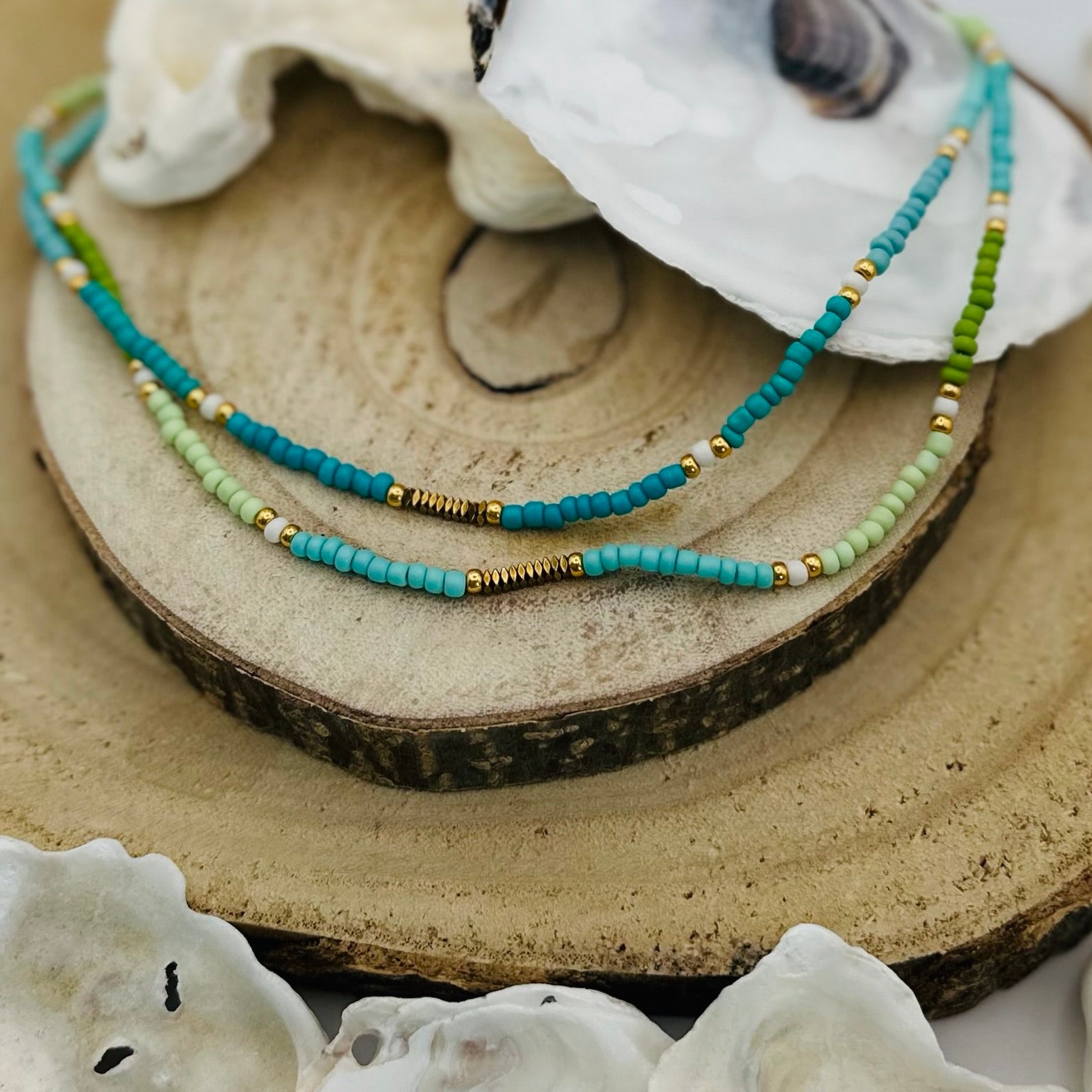 Farbige Halskette mit hübschen matten Rocailles und kleinen gold- oder silberfarbenen Glasperlen. Je nach Modell sind die Farben leuchtend oder pastellfarben, und die harmonische Farbabstimmung ermöglicht vielfältige Kombinationsmöglichkeiten. Diese Halsketten können einzeln oder in Kombination mit dem gleichen oder anderen Modellen der Marke getragen werden.