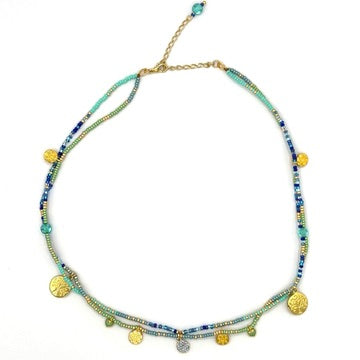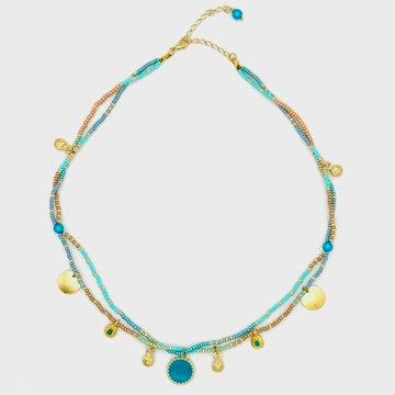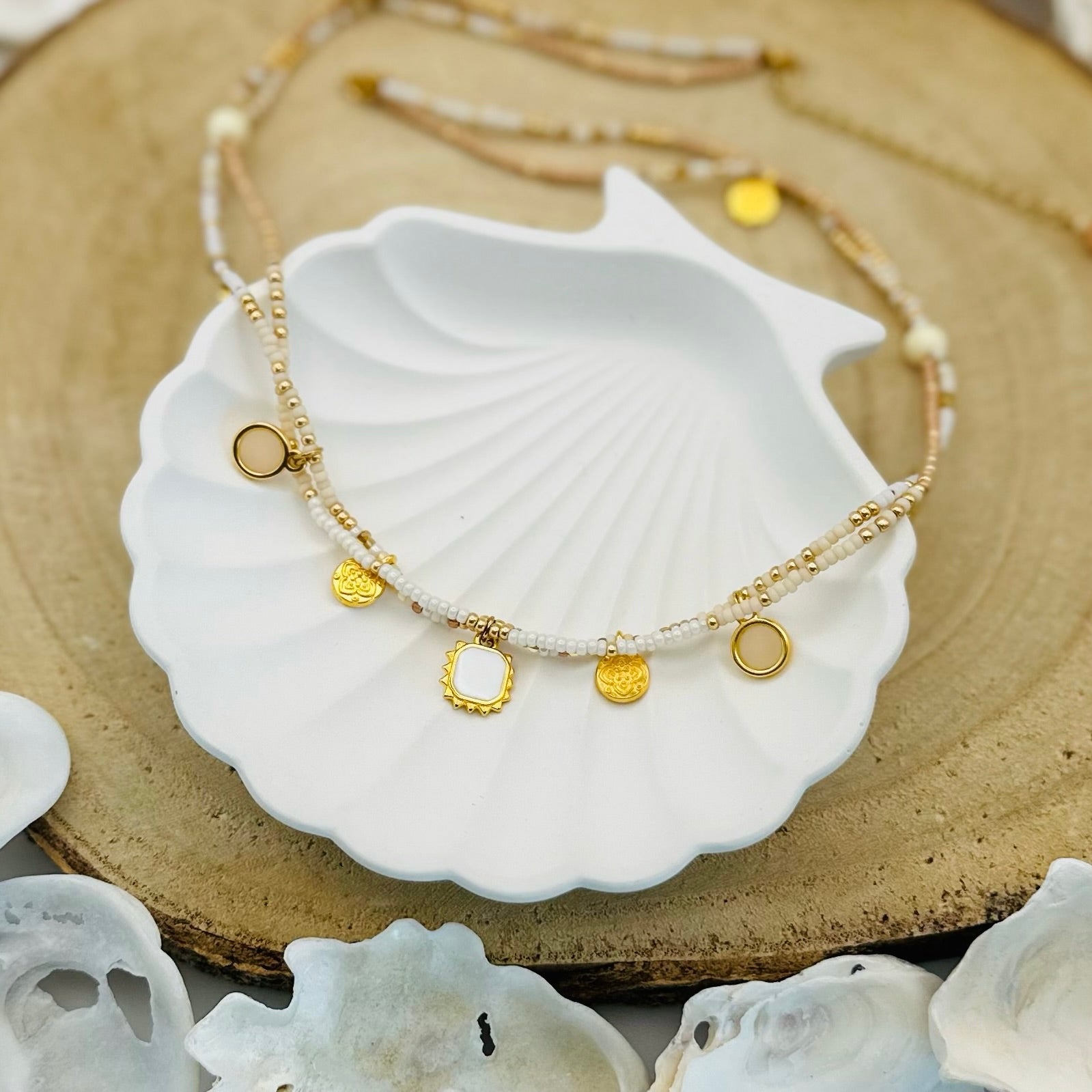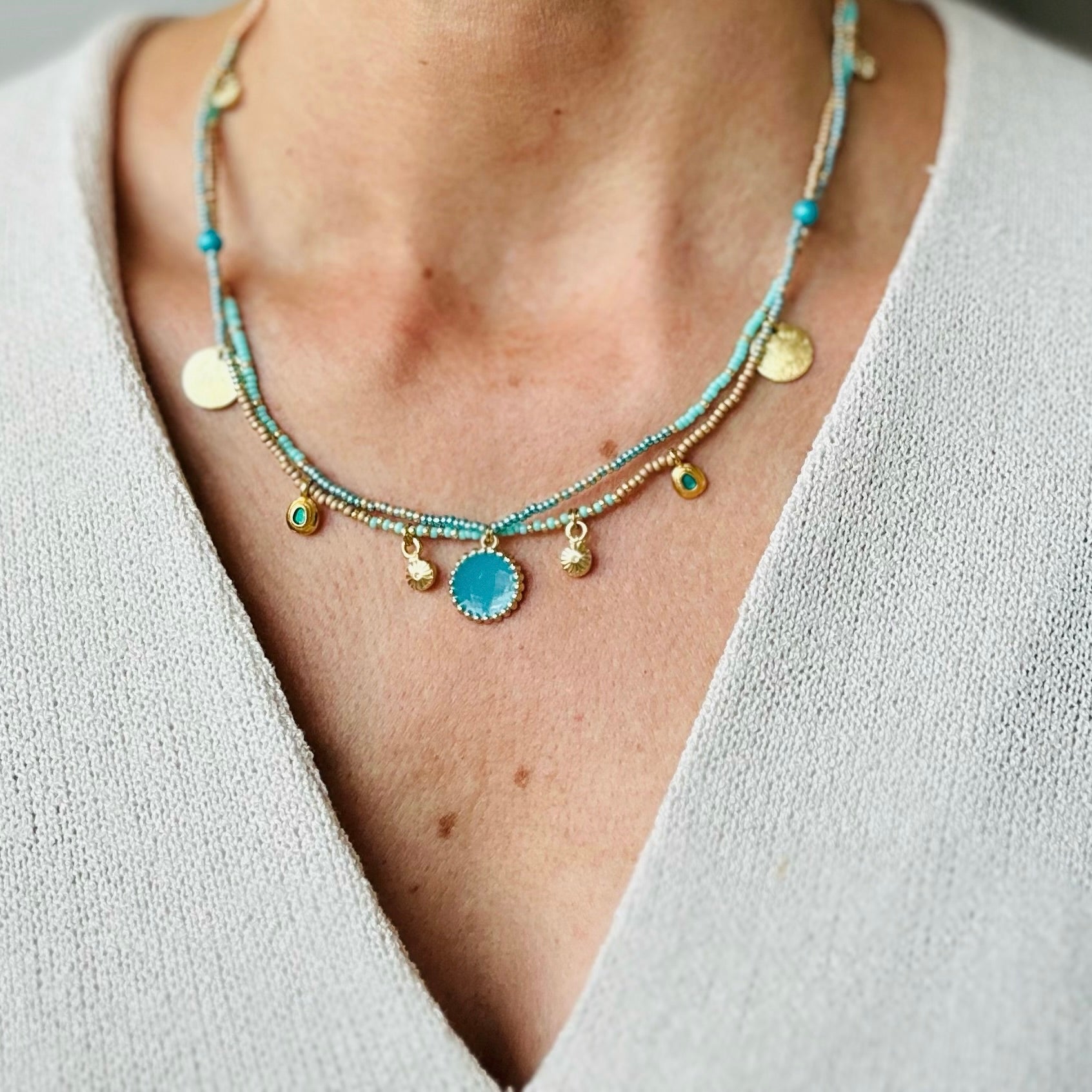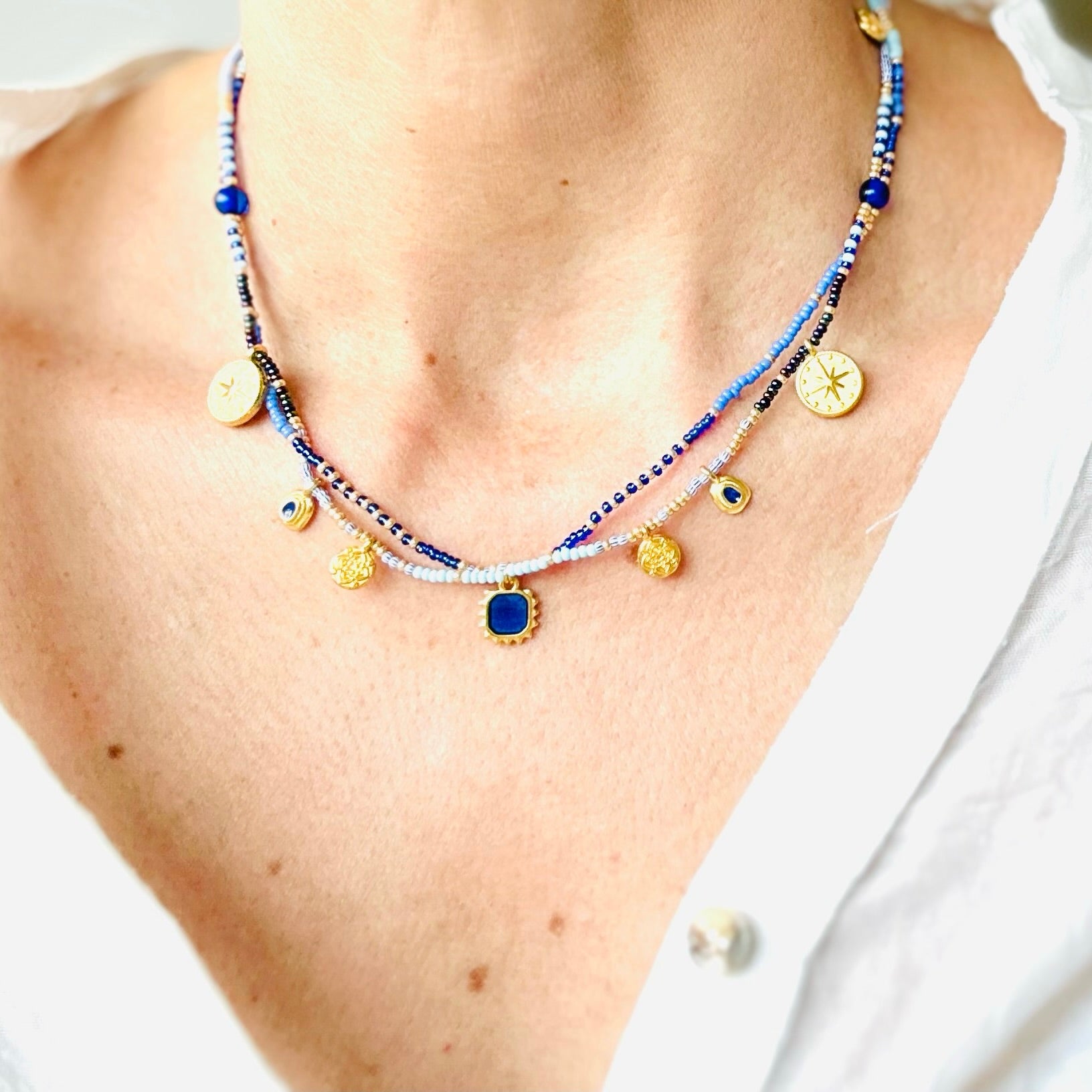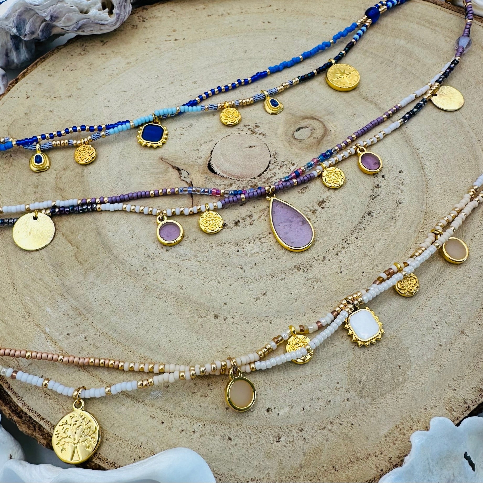 Farbige Halskette mit Quasten und Anhängern. Sie besteht aus zwei ineinander verschlungenen Reihen, gefertigt mit hübschen, farblich abgestimmten Glas-Rocailles, für einen zugleich schicken und bohemischen Effekt. Jedes Modell ist ein Unikat.