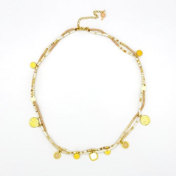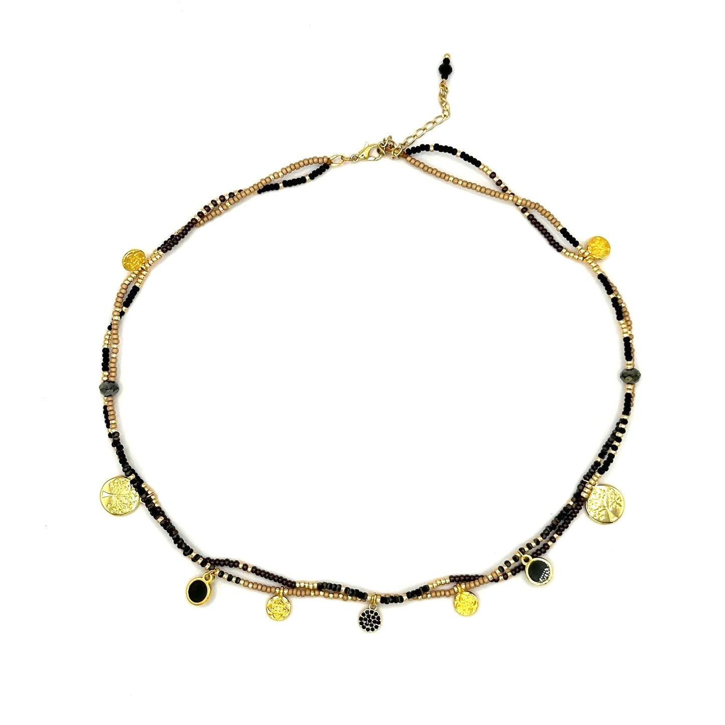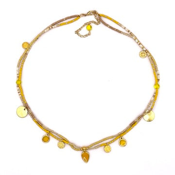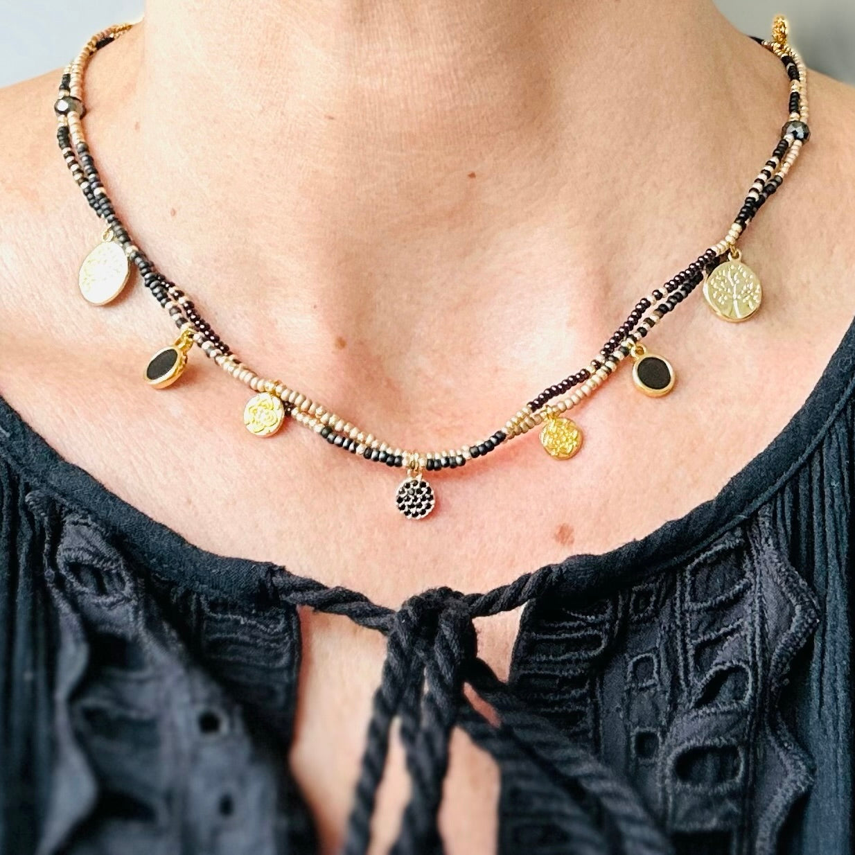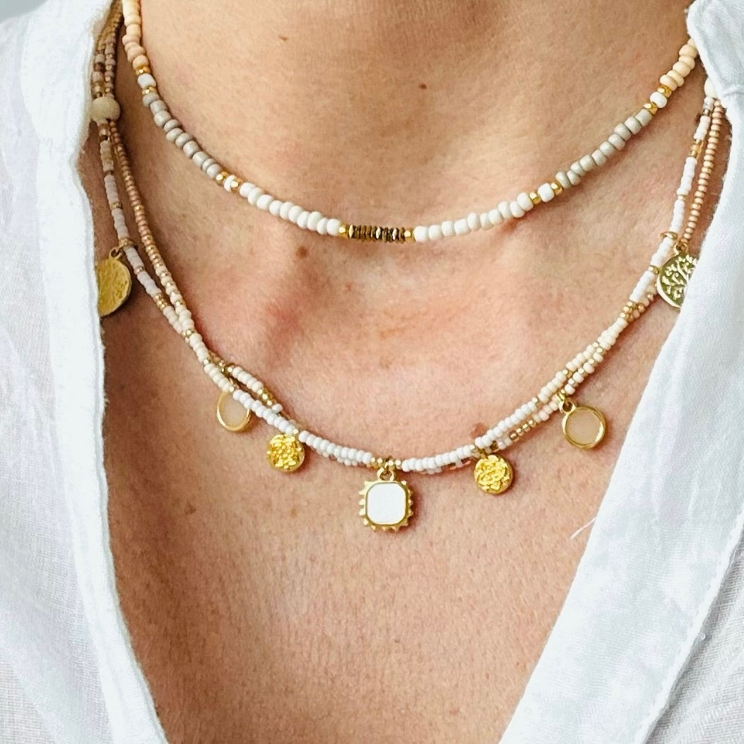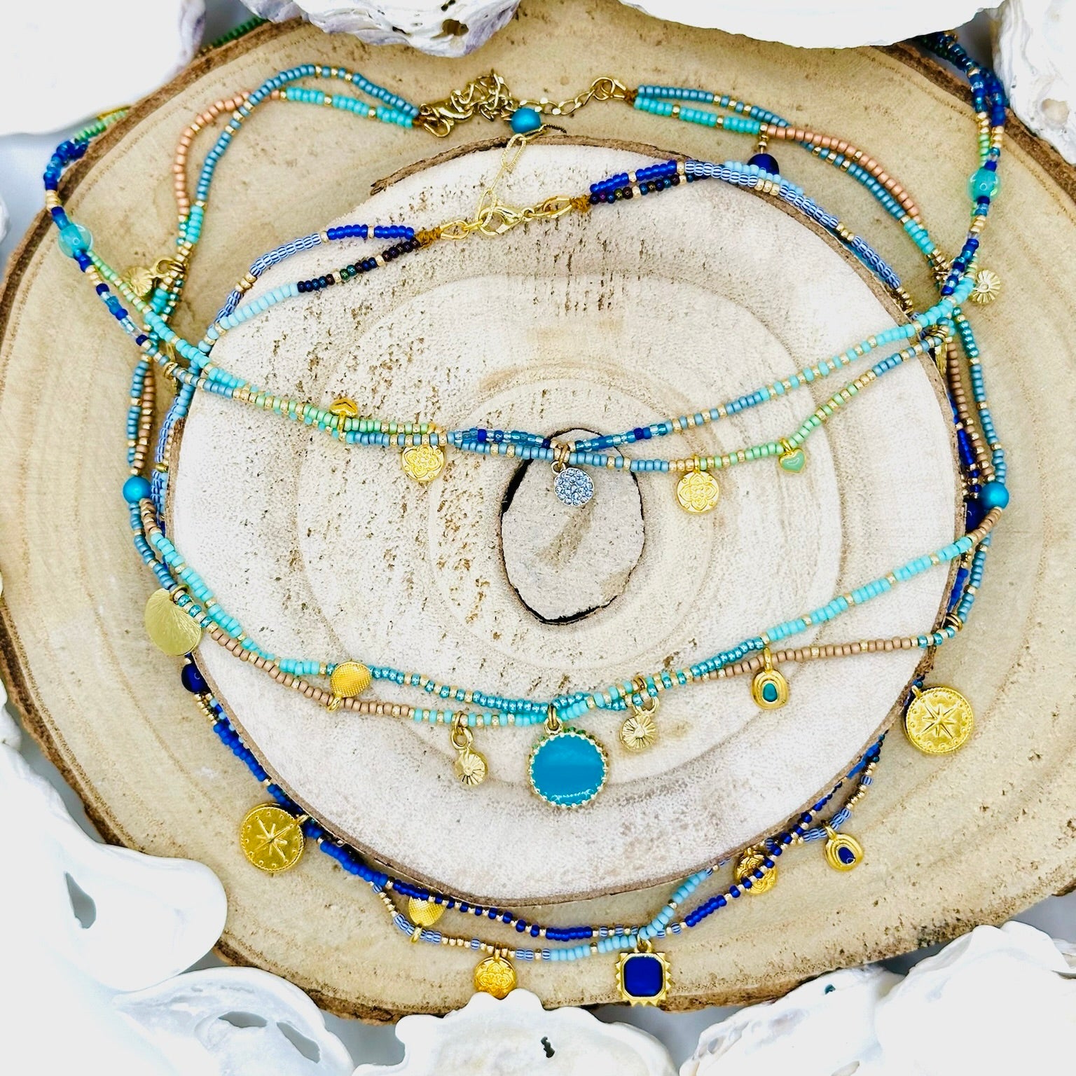 Farbige Halskette mit Quasten und Anhängern. Sie besteht aus zwei ineinander verschlungenen Reihen, gefertigt mit hübschen, farblich abgestimmten Glas-Rocailles, für einen zugleich schicken und bohemischen Effekt. Jedes Modell ist ein Unikat.