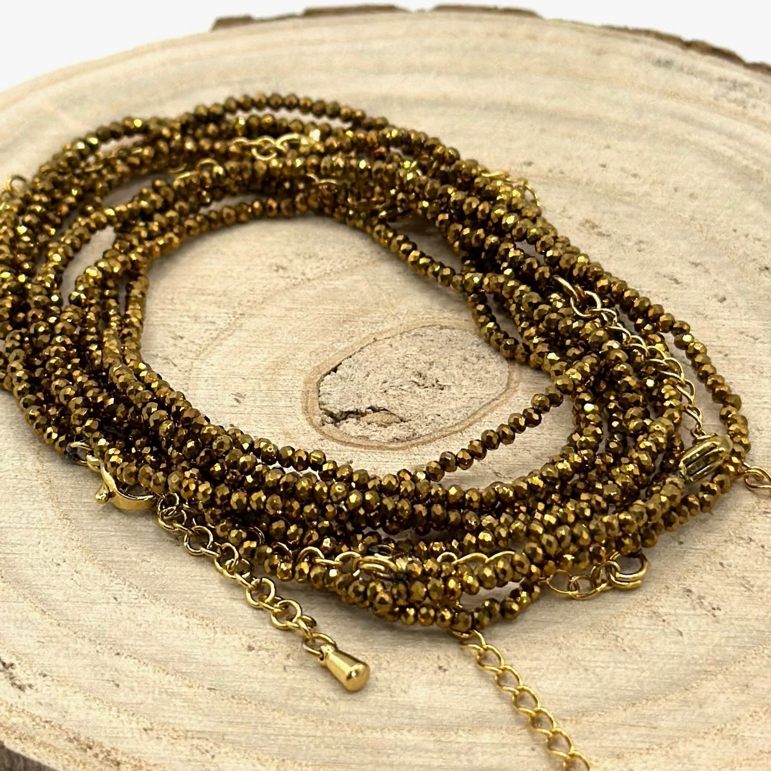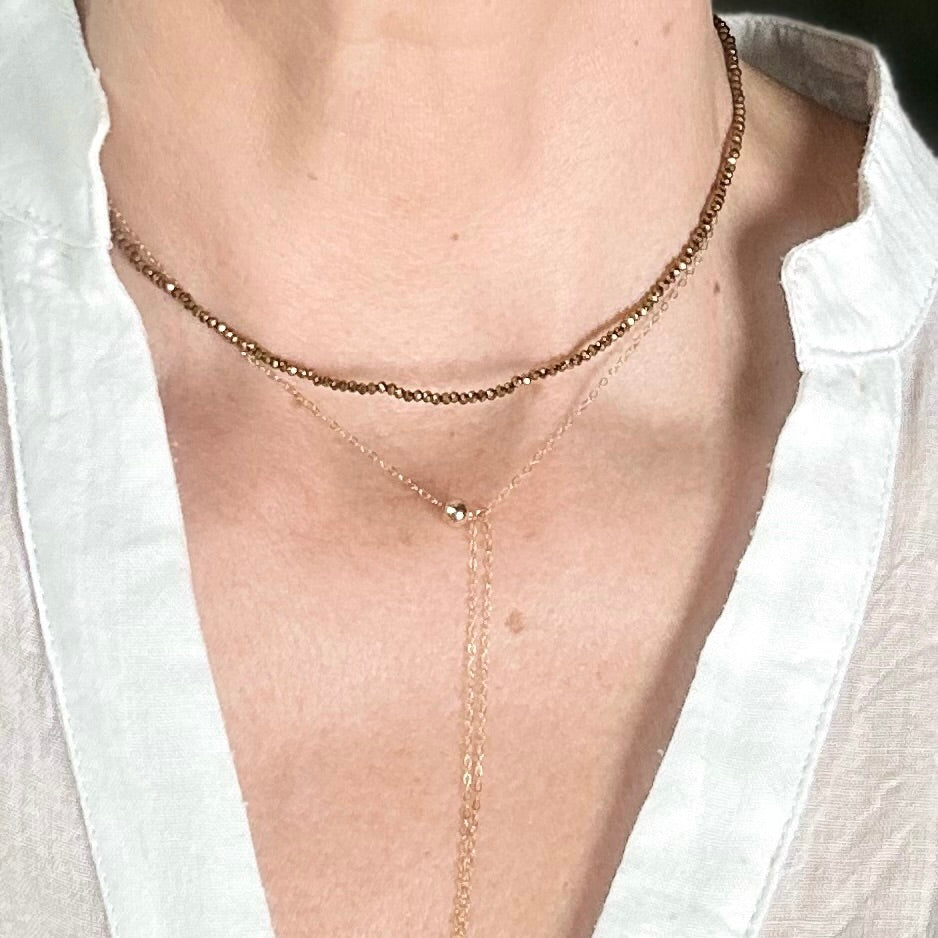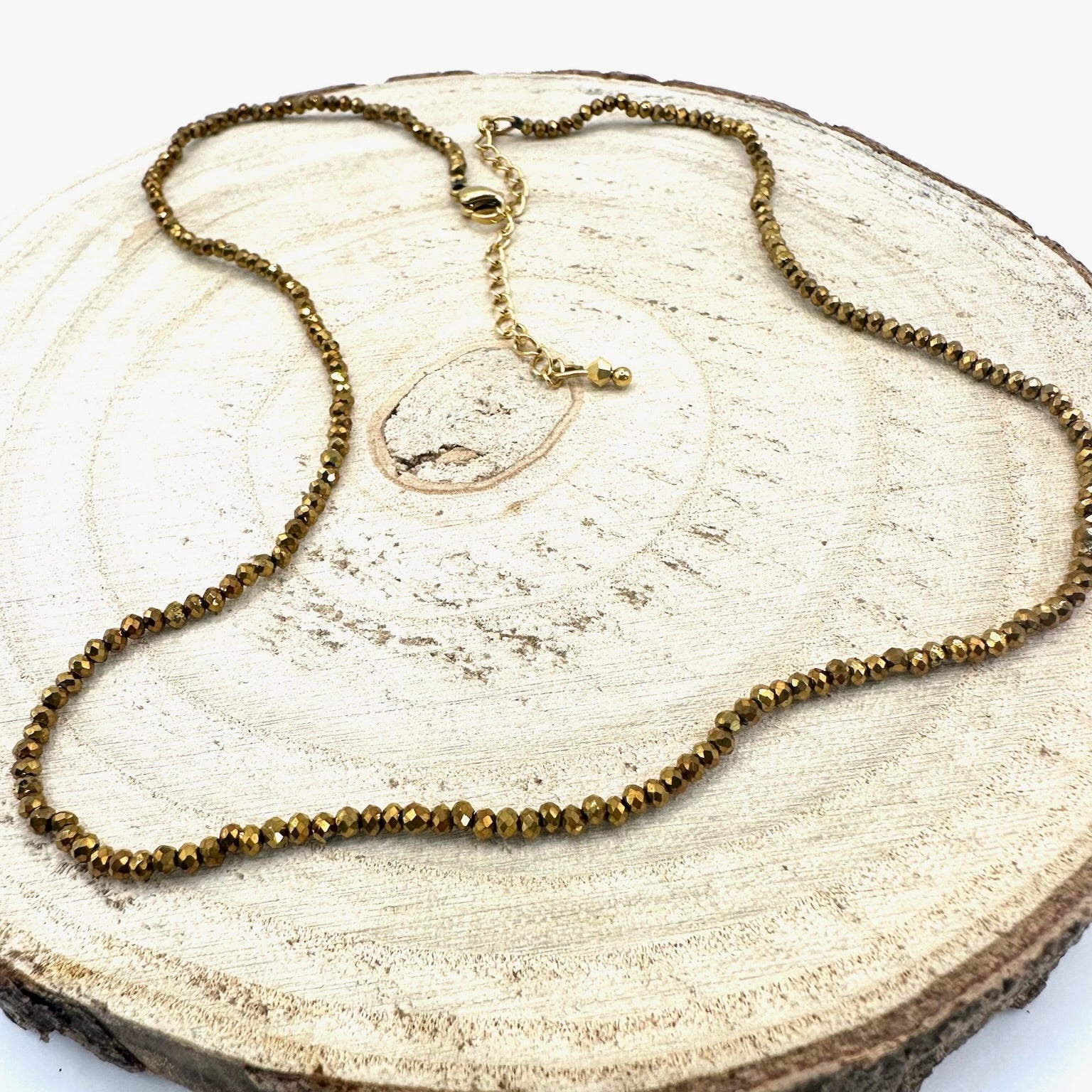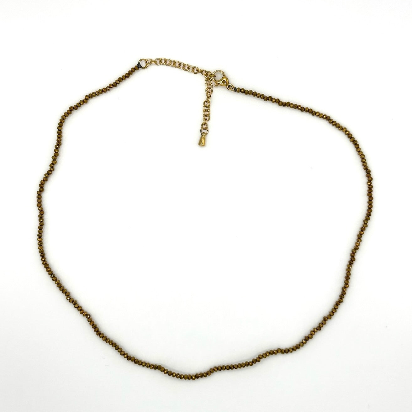 Zeitlose Halskette, eng am Hals getragen, mit 2 mm goldenen Glasperlen, die alleine oder in Kombination getragen werden kann.