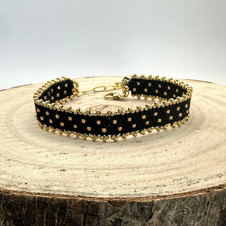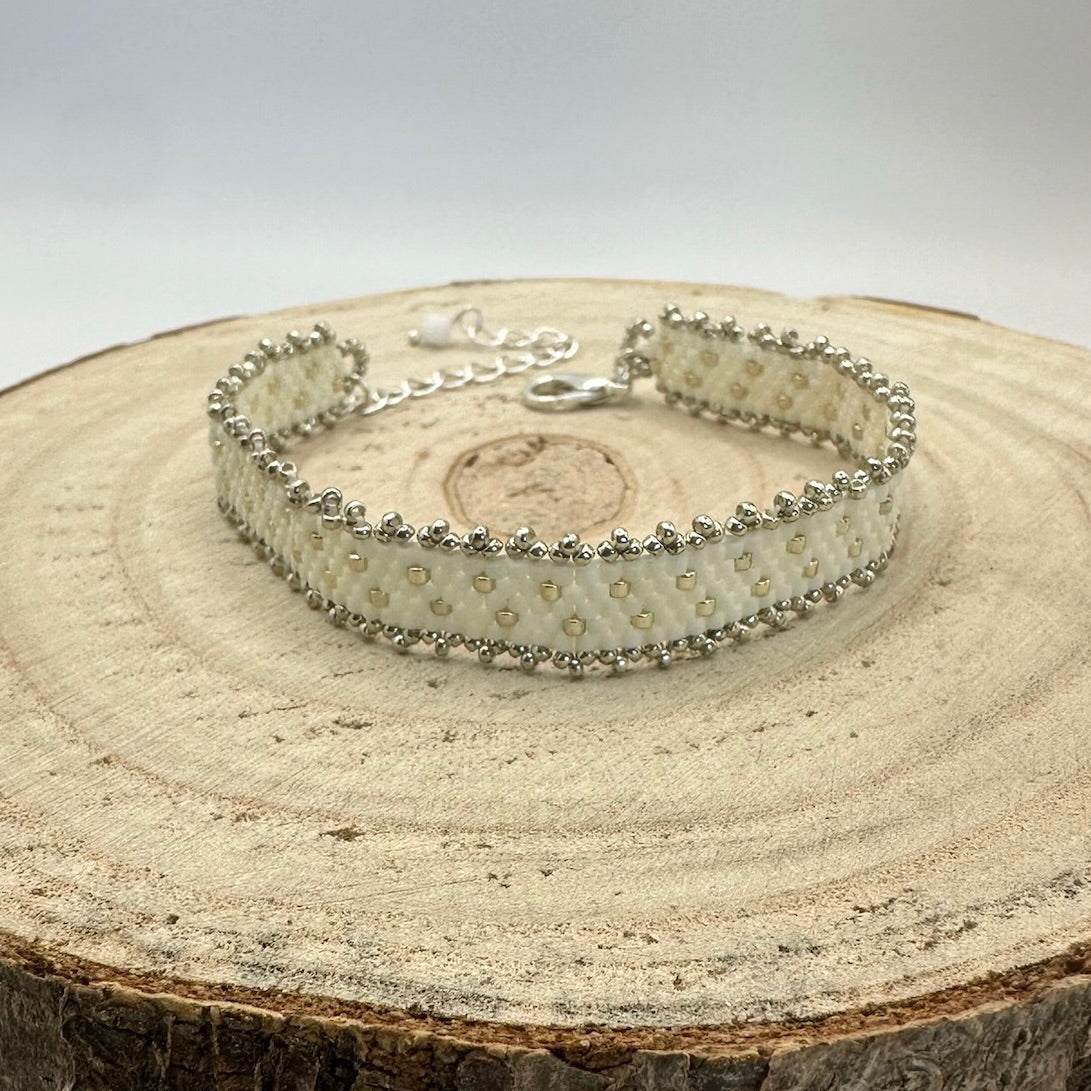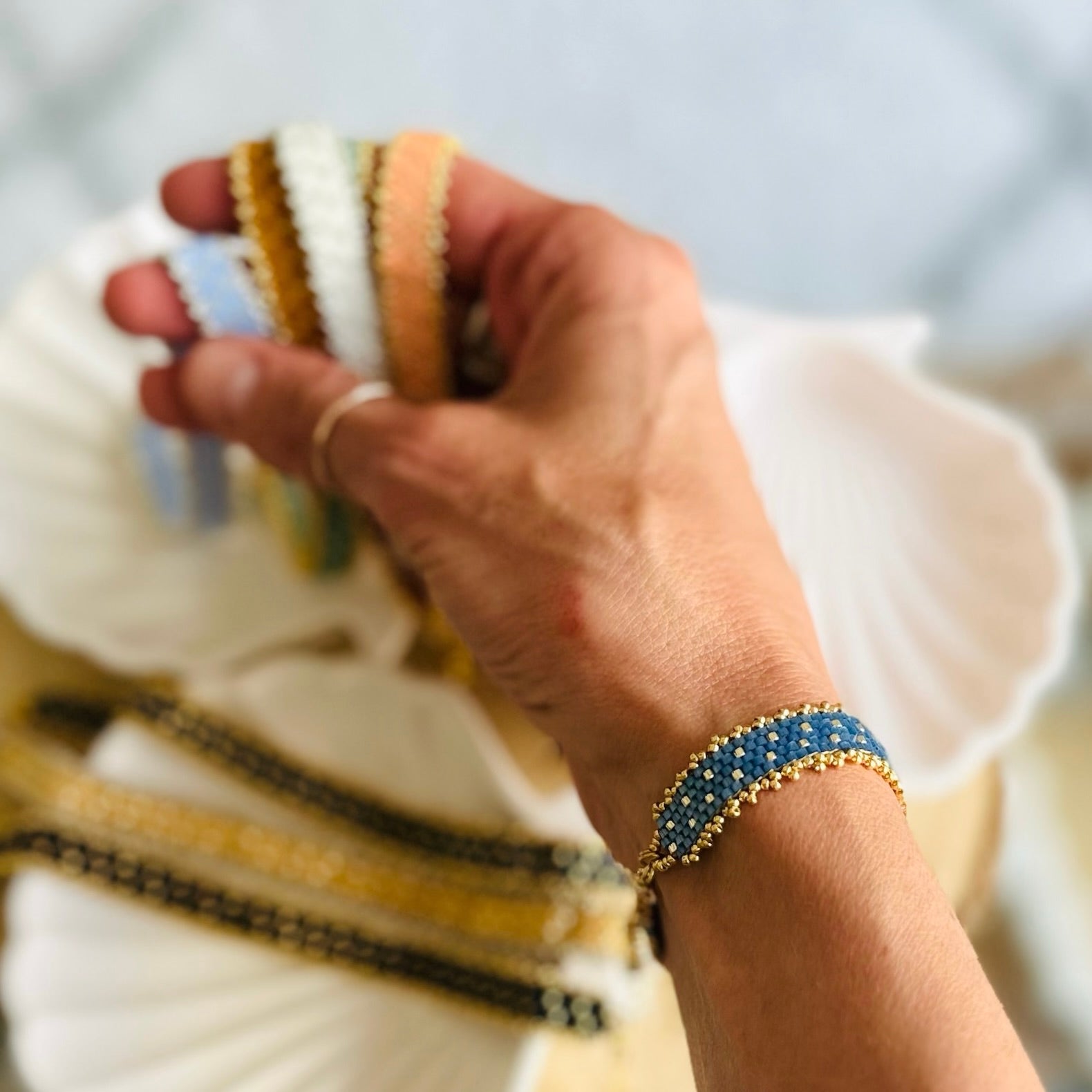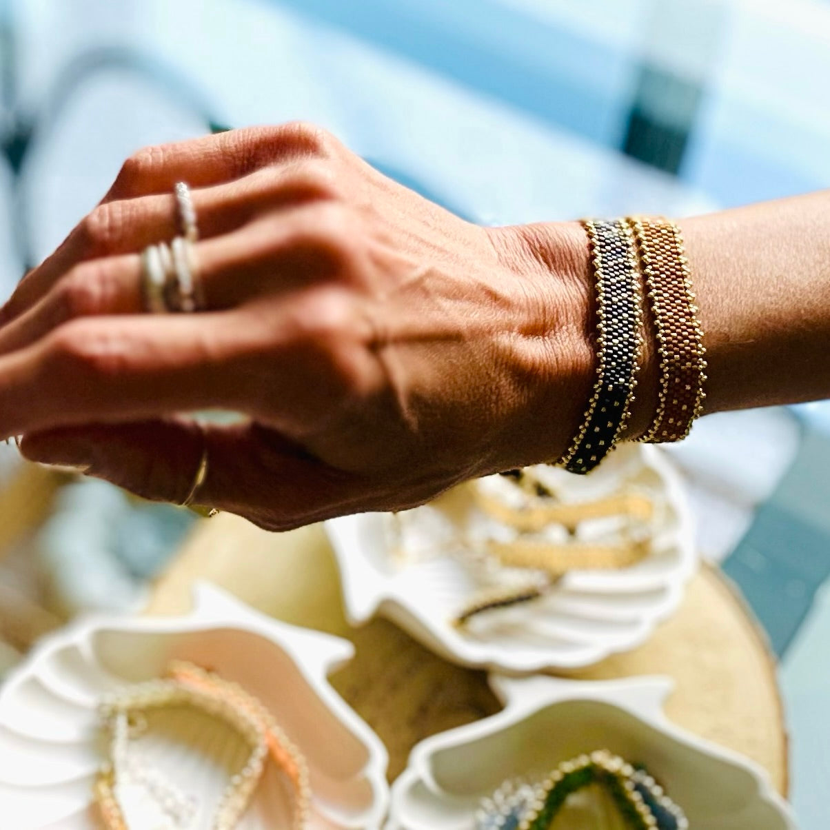 Handgewebtes Armband, vollständig ohne Webstuhl mit einer Nadel gefertigt, mit kleinen Glasperlen, alle auf 1,6 mm kalibriert.