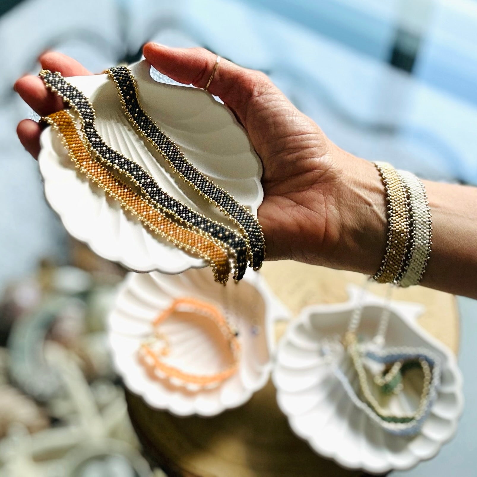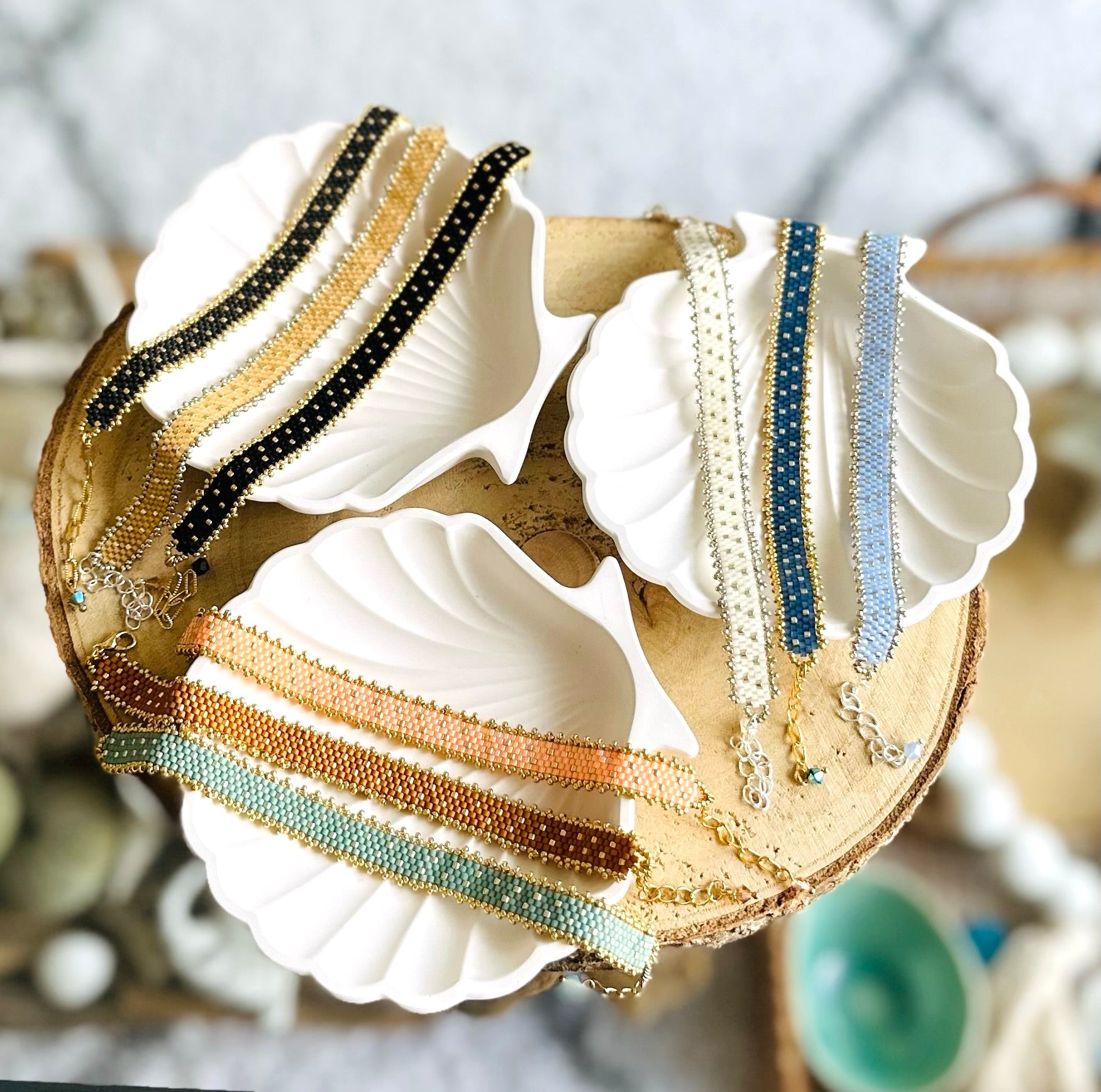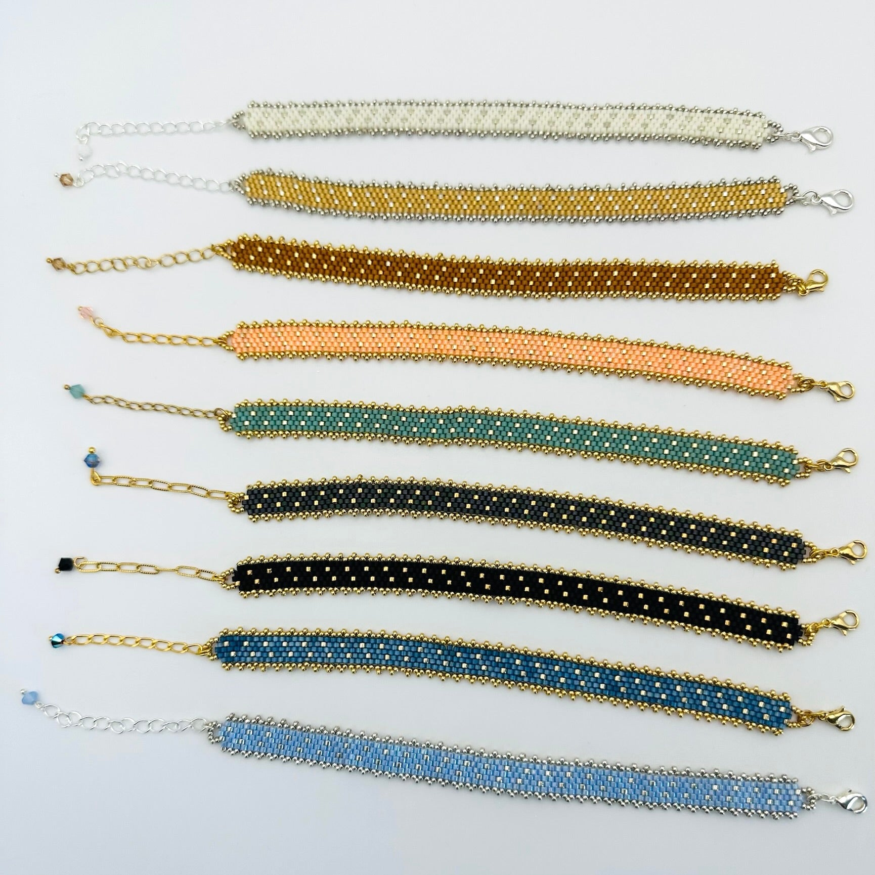 Abschlüsse mit einer gewebten Bordüre aus Mini-Glas-Rocailles in Gold- oder Silberoptik und einem Verlängerungskettchen, verziert mit einer passenden Kristallperle.