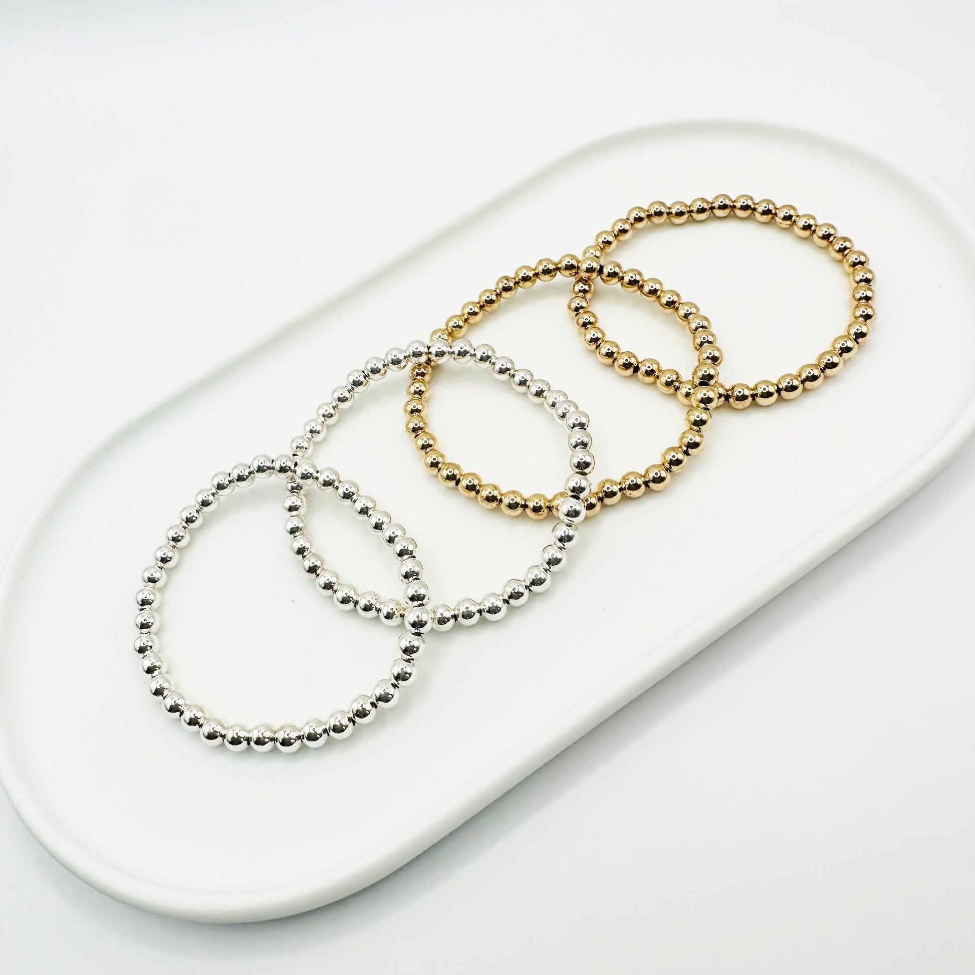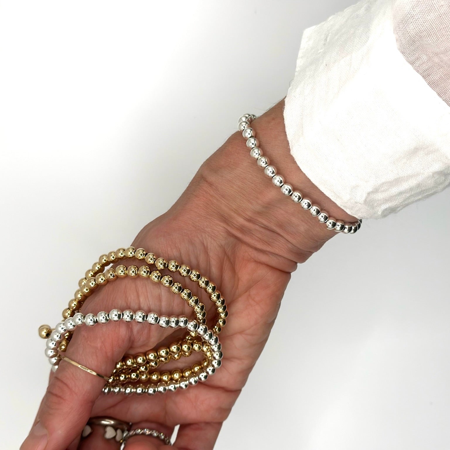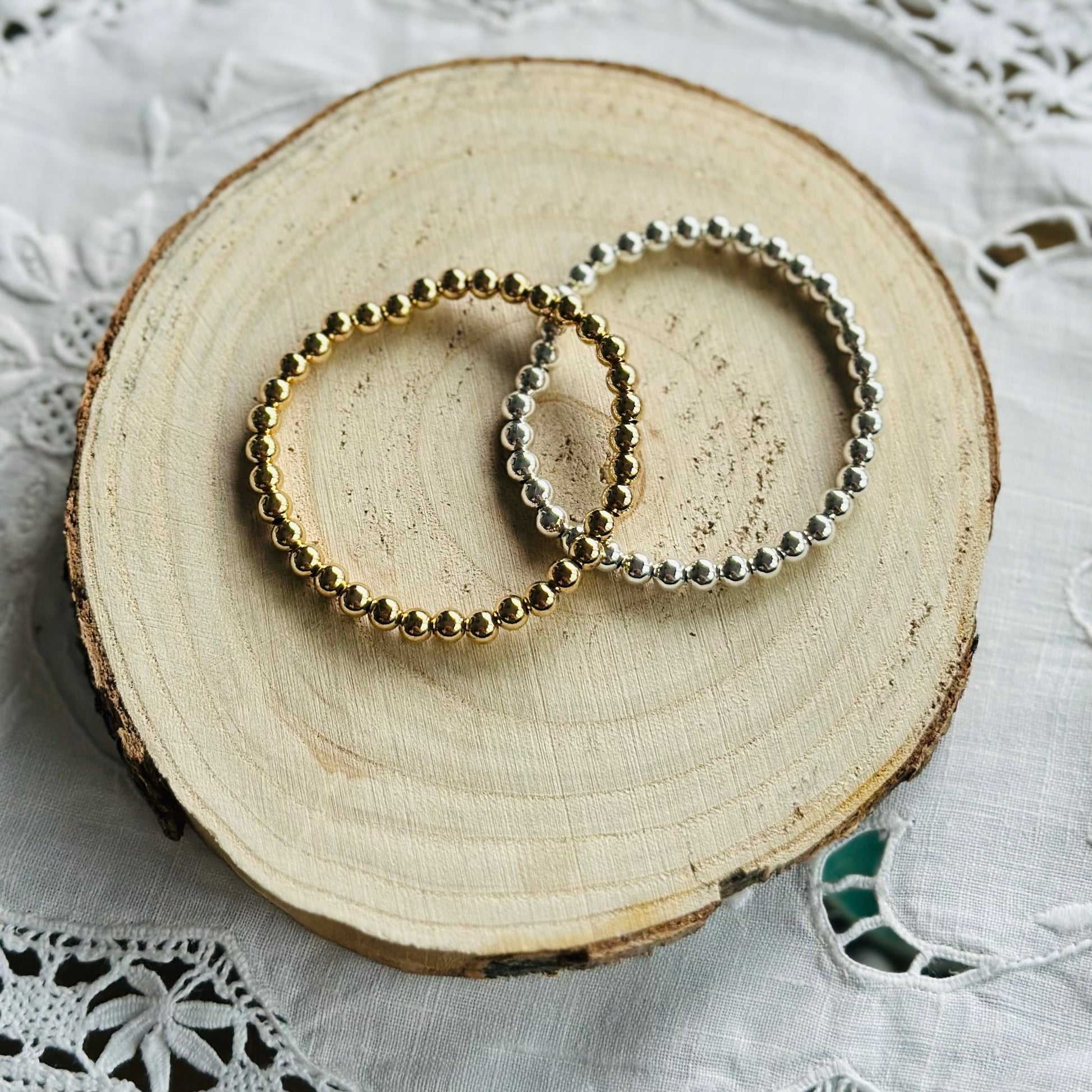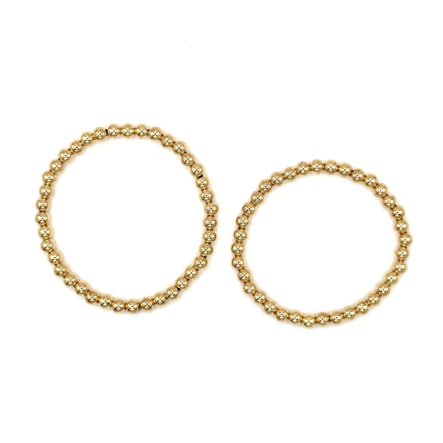 GOLD : Zeitloses, sehr schickes Armband, das allein oder mit anderen Armbändern getragen werden kann. Perlen von 5 mm aus Gold-Filled (laminiertem Gold). 2 Größen für kleine oder große Handgelenke. Diese Armbänder sind auf einem elastischen Faden montiert und daher sehr dehnbar für alle Größen. Gold-Filled 14K - 585/1000, bleifrei, nickelfrei, kadmiumfrei.