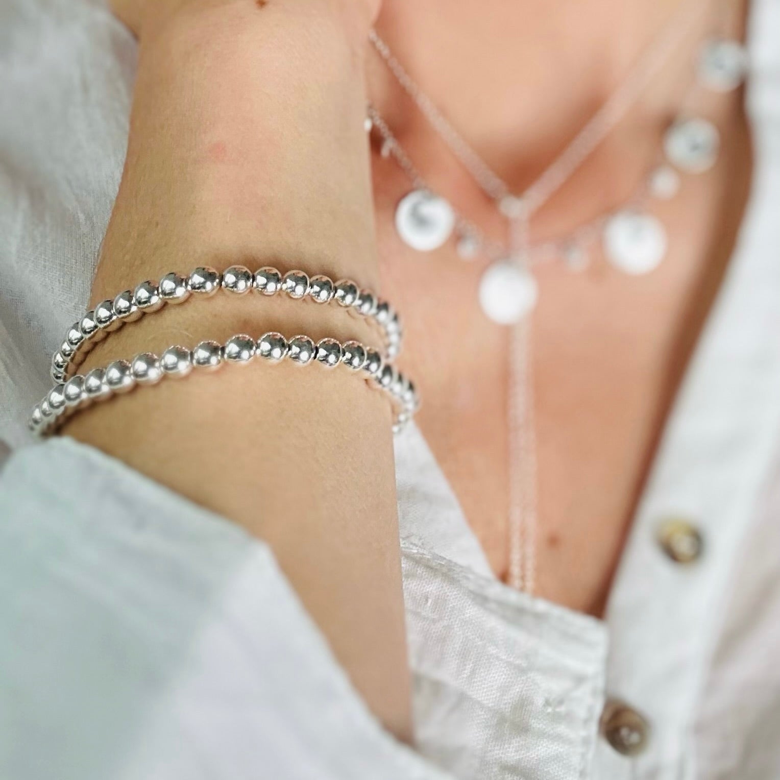 SILBER : Zeitloses, sehr schickes Armband, das allein oder mit anderen Armbändern getragen werden kann. Perlen von 5 mm aus 925er Silber. 2 Größen für kleine oder große Handgelenke. Diese Armbänder sind auf einem elastischen Faden montiert und daher sehr dehnbar für alle Größen. 925/1000 Silber, bleifrei, nickelfrei, kadmiumfrei.